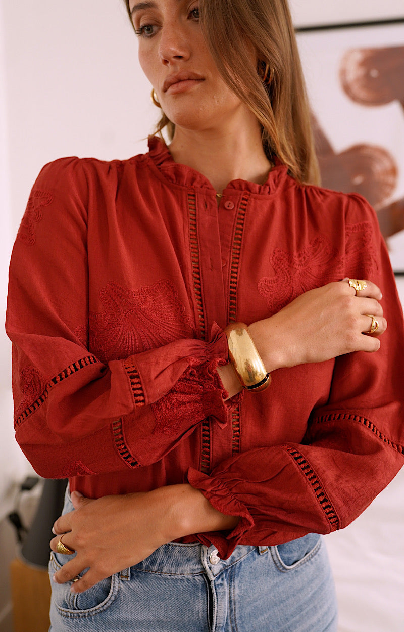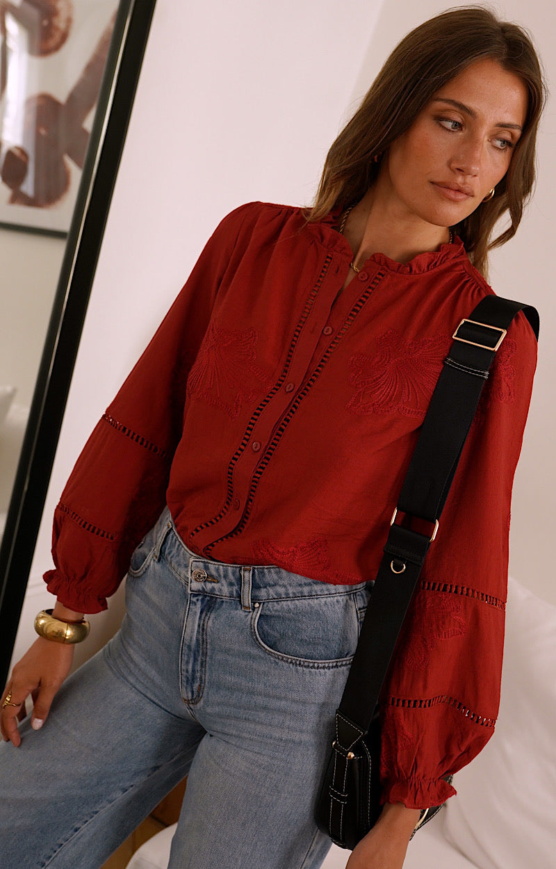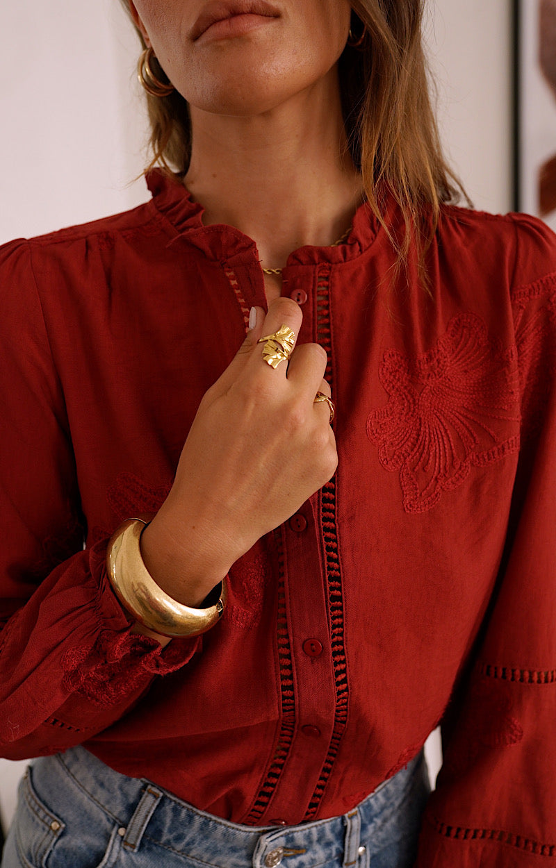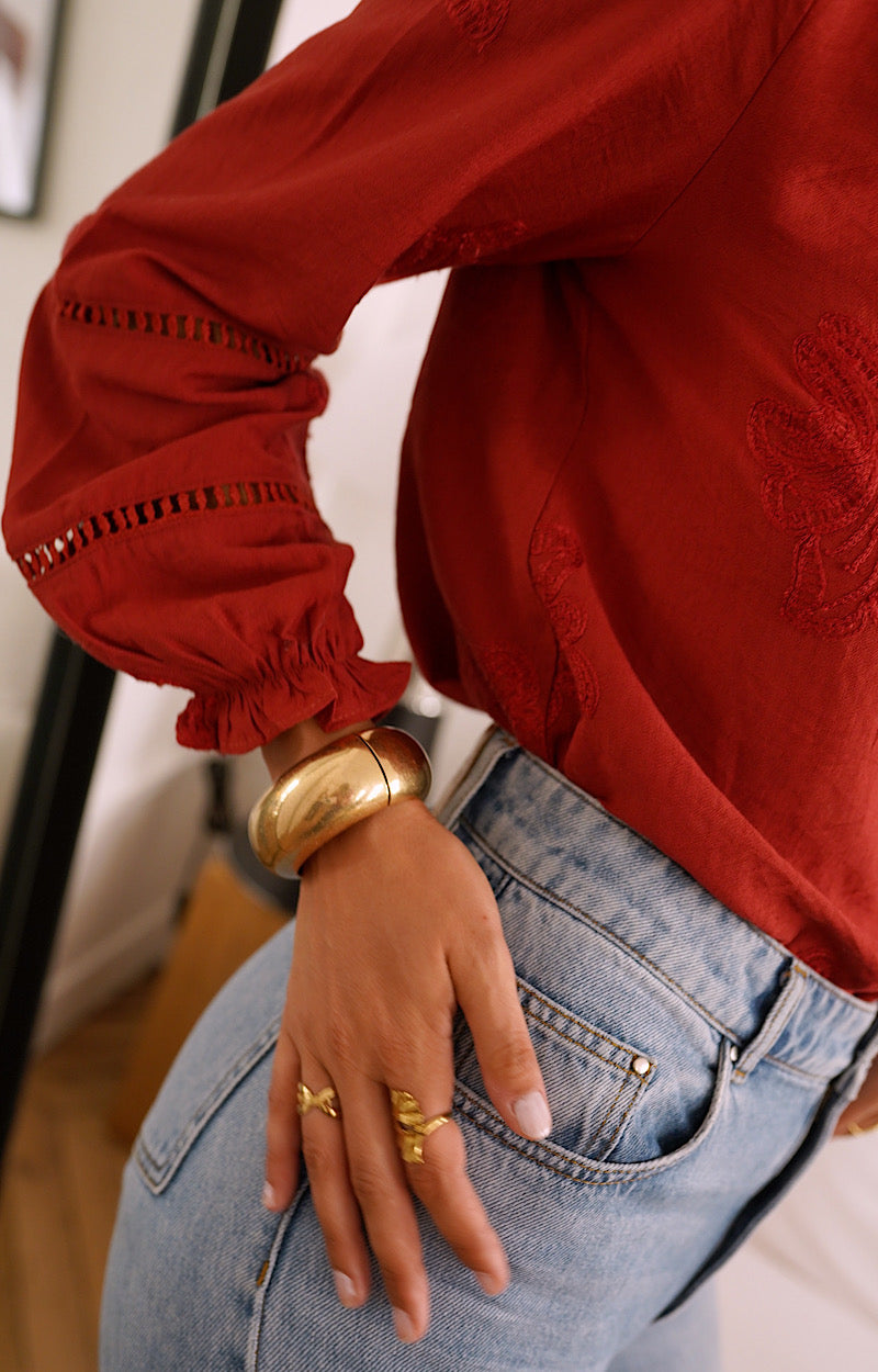 C'est une chemise en viscose avec de très belle broderie et elle est facile à mettre. Existe aussi en bleu