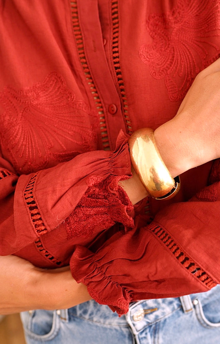 C'est une chemise en viscose avec des broderies et elle est facile à mettre pour tous les jours. Elle existe en bleu marine et beige.