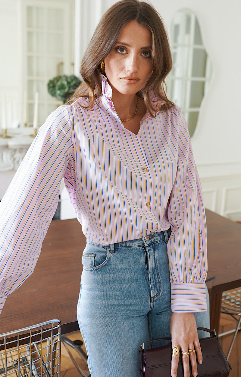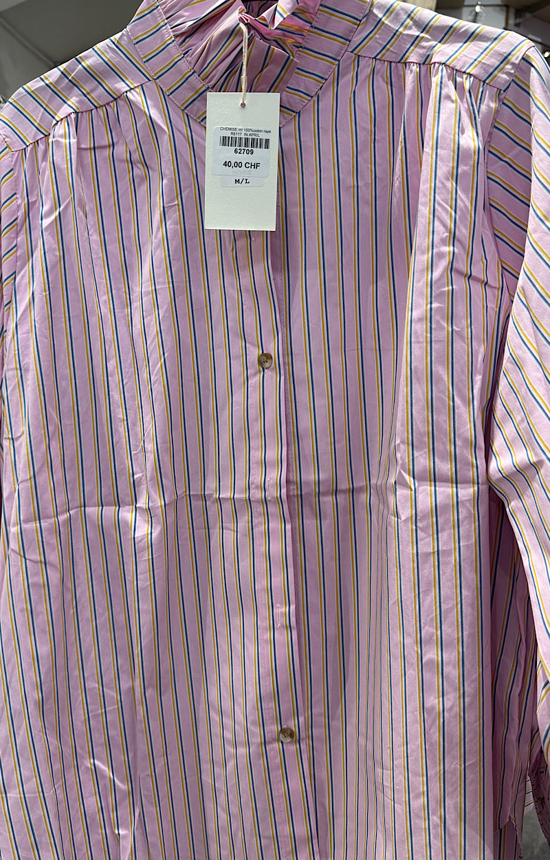 C'est une chemise en coton fond rose rayé bleu et beige .
