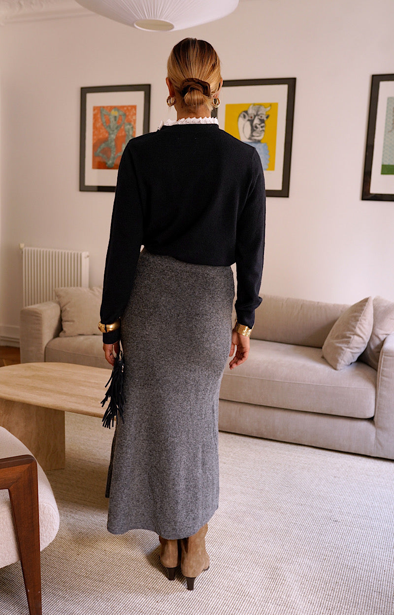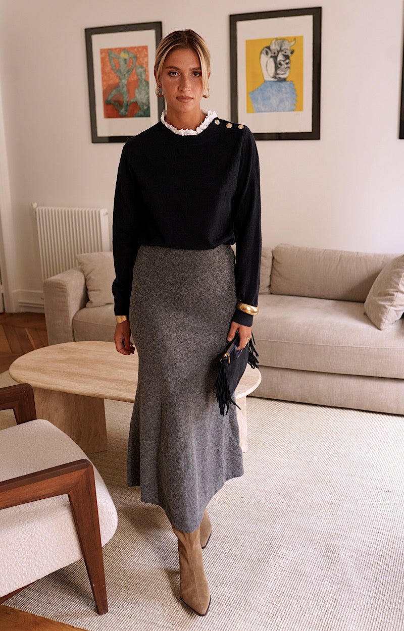 C'est un pull avec un col dentelle et boutons, il est tendance à mettre pour tous les jours. Existe aussi en vert sapin, moutarde, marine et gris.